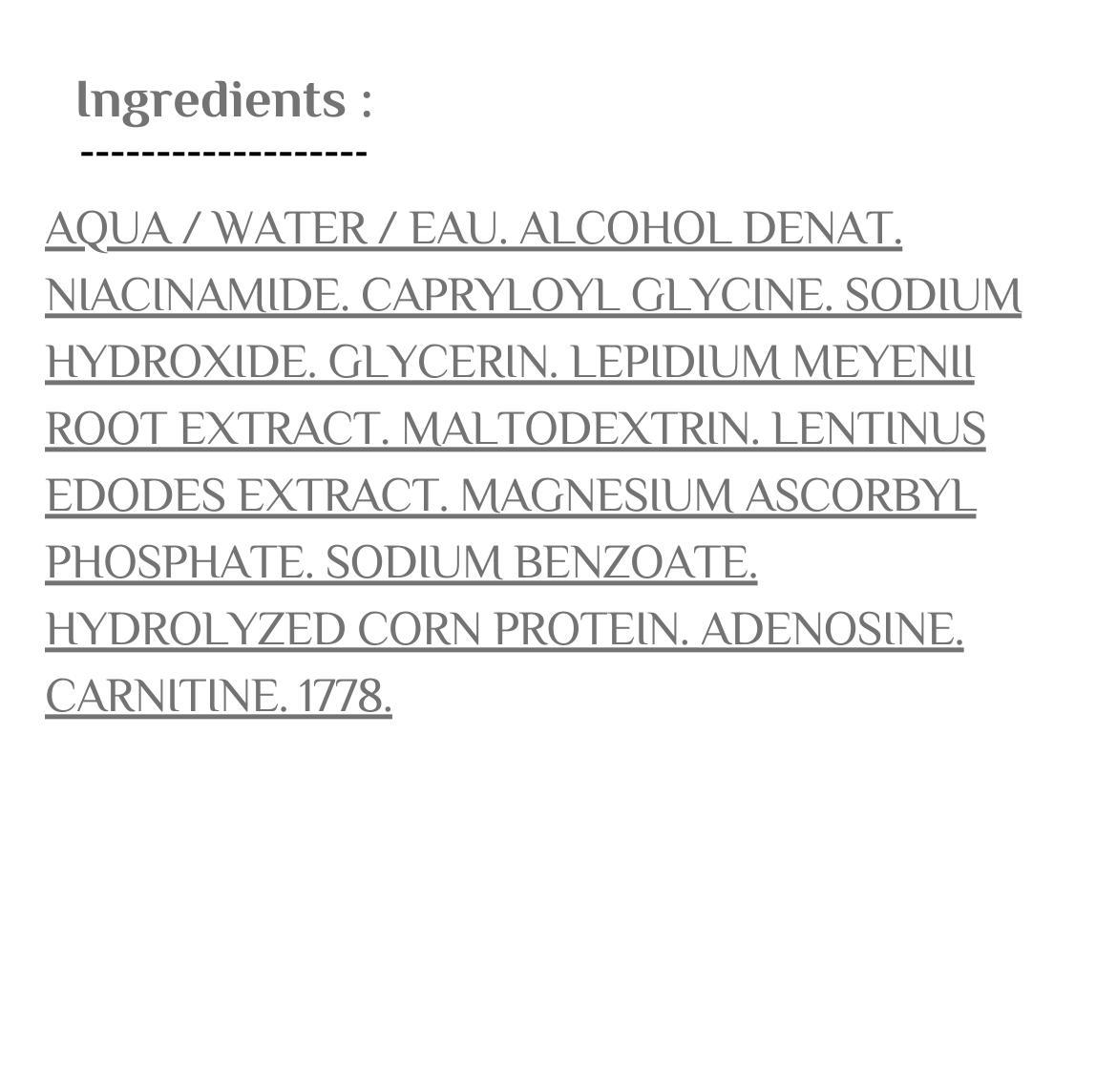 يحتوي على 95% من المكونات ذات الأصل الطبيعي، غني بمستخلص الماكا الحاصل على براءة اختراع، والأحماض الأمينية الموجهة بيولوجيًا، ومستخلص الشيتاكي الحاصل على براءة اختراع.