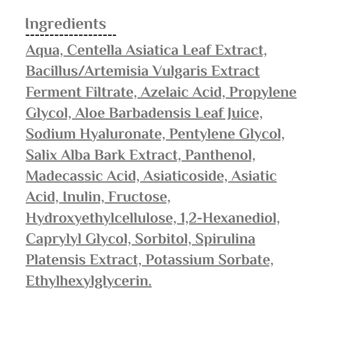 • مستخلص السنتيلا (Cica): يهدئ البشرة ويدعم إصلاحها الطبيعي.