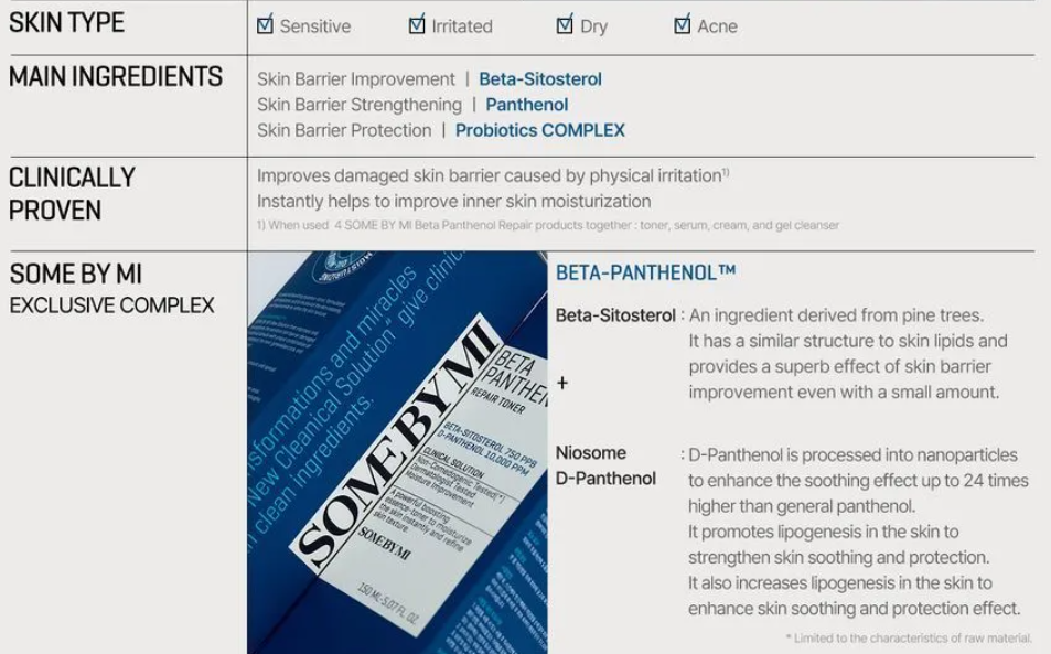 امنحي بشرتك الجافة أو الباهتة إعادة تنشيط فورية مع هذا التونر المهدئ والمُصلح للحاجز الجلدي، الغني بـ بيتا بانتينول (المزيج الحاصل على براءة اختراع من SOME BY MI الذي يحتوي على D-بانثينول وبيتا-سيتوستيرول). مزيج من البروبيوتيك يعزز صحة البشرة بشكل إضافي. التركيبة خالية من الكحوليات والبارابين. التونر تم اختباره من قبل أطباء الجلدية ليكون مناسباً للبشرة الحساسة والمعرضة لحب الشباب.