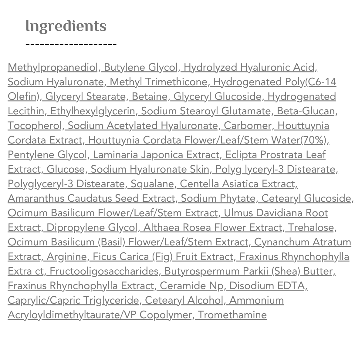 هيالورونيك اسيد, بيتائين, سيراميد, مستخلص نبات الهارتليف, ماء زهور وأوراق وساق الهارتليف بنسبة 70%, مستخلص الطحالب البحرية اليابانية, مستخلص أوراق نبتة الإكليبتا