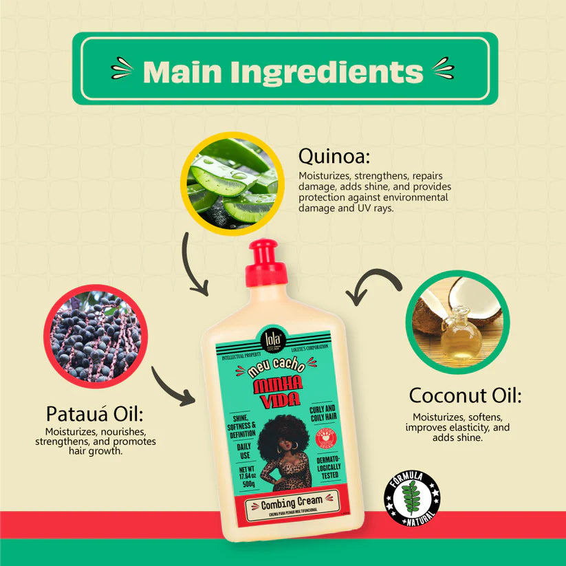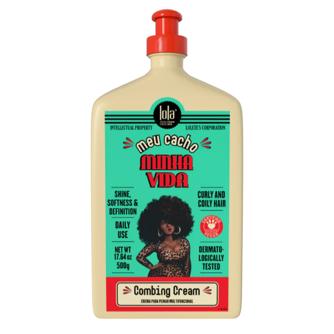 كريم Combing Cream Meu Cacho Minha Vida من Lola Cosmetics صُمم خصيصًا للشعر الكيرلي والمجعد ليمنحك تموجات ناعمة، مُحددة، ولامعة دون تثقيل الشعر أو ترك بقايا دهنية.
