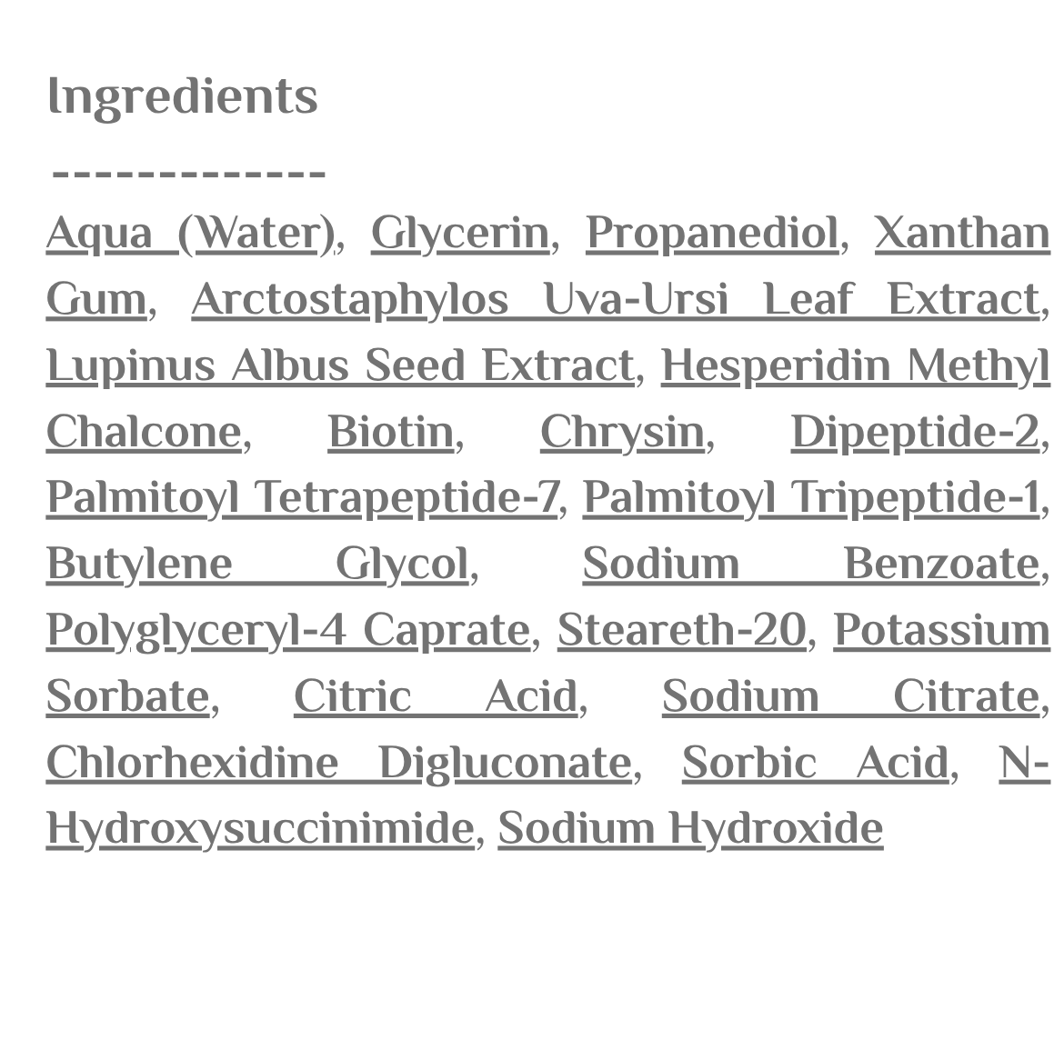 جليسرين، مستخلص أوراق أركتوستافيلوس ، مستخلص بذور الترمس ، بيوتين ، حامض الستريك، كلورهيكسيدين ديجلوكونات، حمض السوربيك .