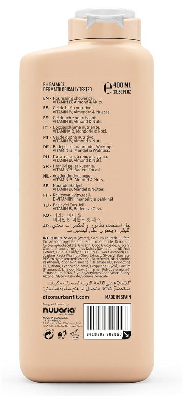 جل الاستحمام ديكورا أوربان فت بفيتامين ب + اللوز والمكسرات يتميز بتركيبته المغذية التي تحتوي على فيتامين ب ومستخلصات من اللوز والمكسرات. هذا الجل ينظف البشرة بلطف ويمنحها الترطيب اللازم، مما يجعلها ناعمة ومنتعشة. يمنحك هذا الجل شعورًا بالنشاط والحيوية خلال وبعد الاستحمام.