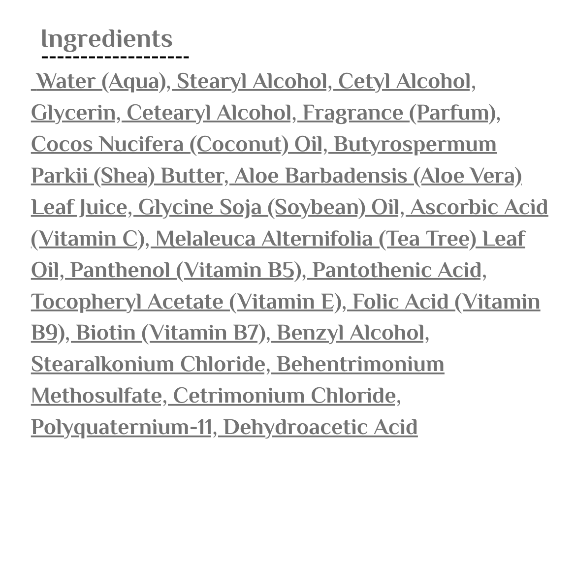 زيت جوز الهند، زبدة الشيا، جل الألوفيرا، زيت الصويا، فيتامين E، فيتامين B5 (بانثينول)، فيتامين C، البيوتين، زيت شجرة الشاي.