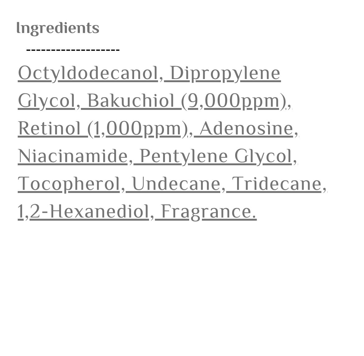 - 0.1% ريتينول و0.9% باكوشيول: يقللان من ظهور الخطوط الدقيقة والتجاعيد مع تحسين ملمس البشرة.