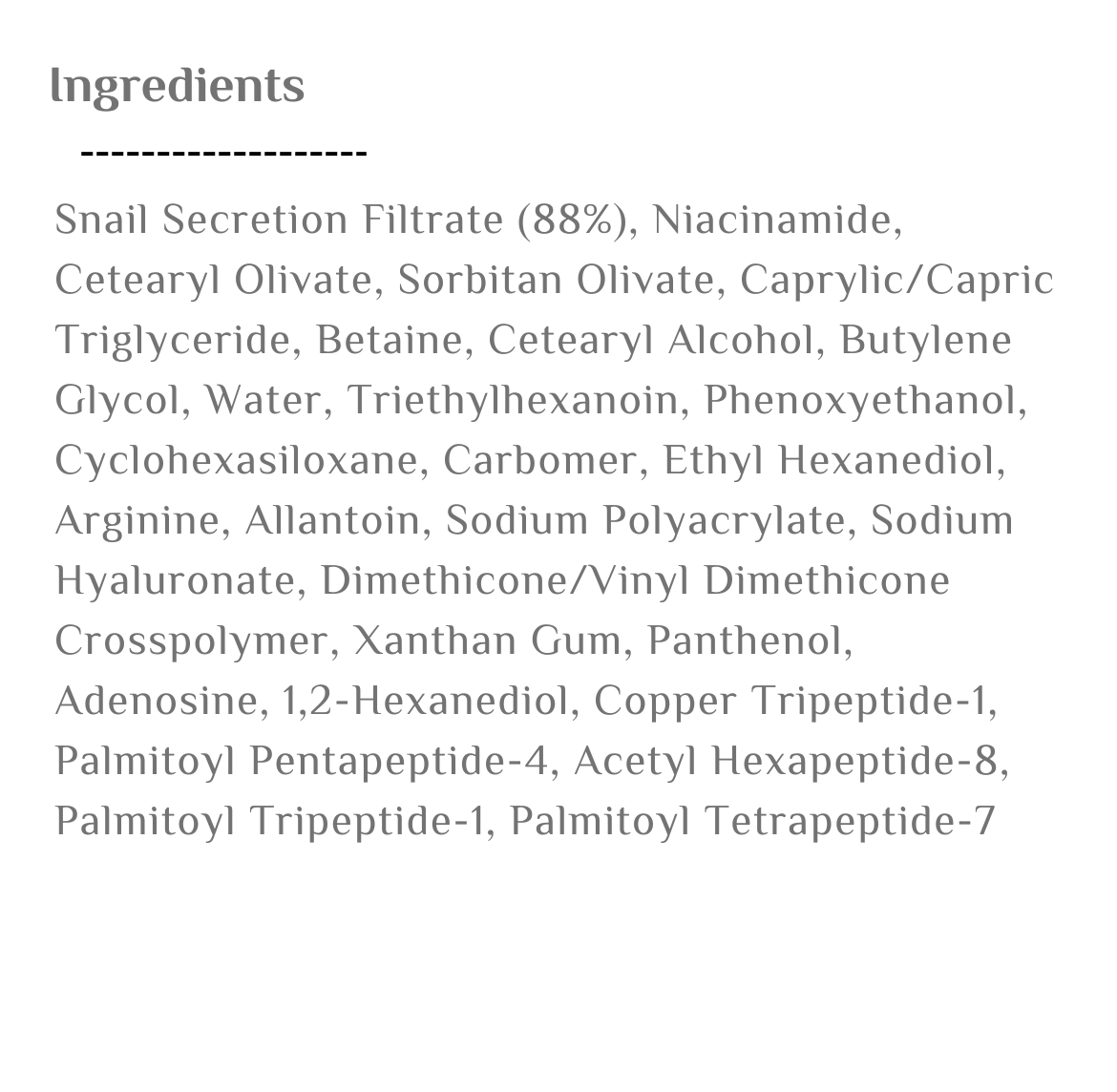 88% مستخلص الحلزون, ببتيدات, هيالورونات الصوديوم, بانتينول, الانتوئين, نياسيناميد