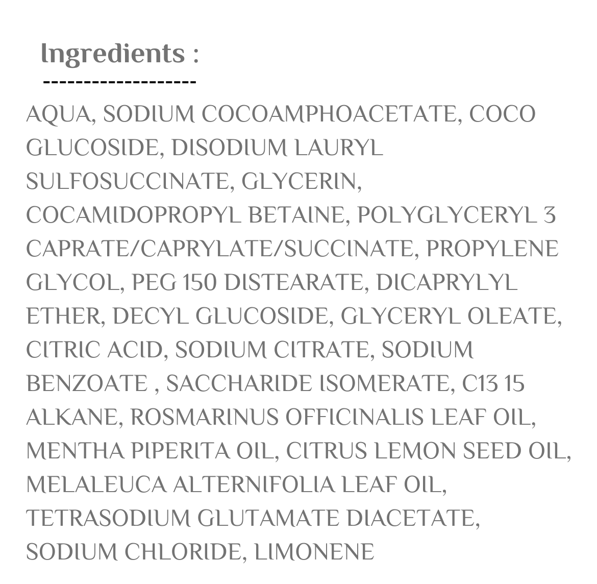 المكونات الاساسية:زيوت الروزماري والنعناع وبذور الليمون وشجرة الشاي , سكاريد إيزوميرات, هيميسكوالان عشبي