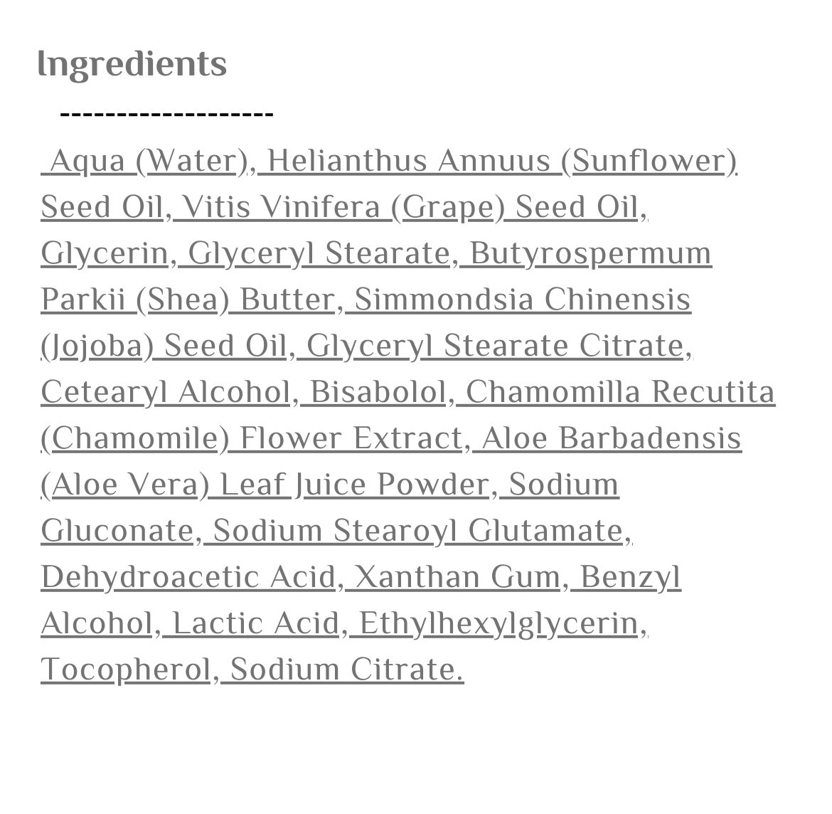بابونج, بيزابولول, زيت الجوجوبا, زبدة الشيا, الوفيرا, لاكتك اسيد