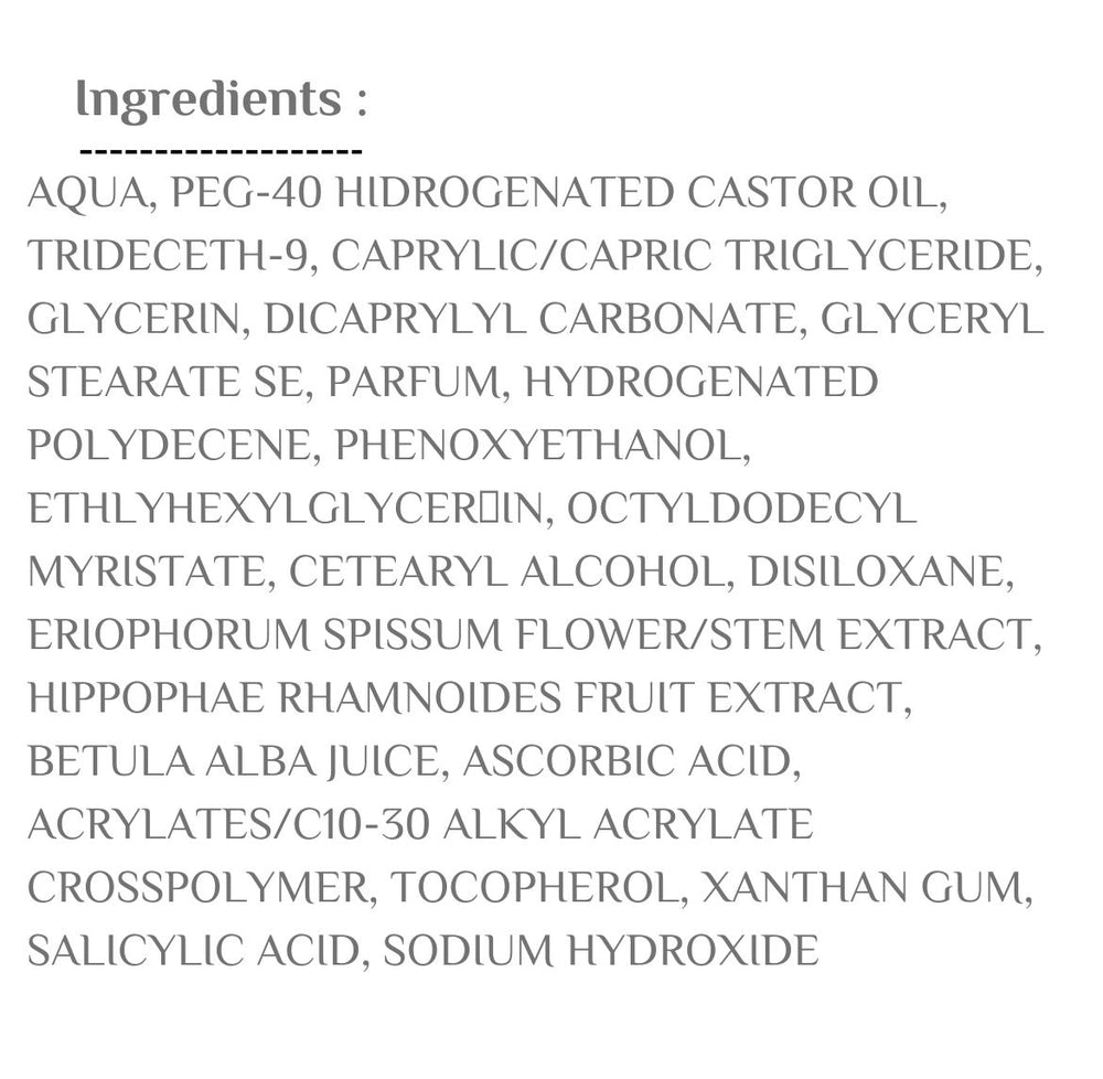 يرطب البشرة ويمنحها تأثيرًا لامعًا بتركيبته العشبية الخاصة المطورة للبشرة الدهنية والمختلطة. مستخلص نبق البحر يحمي البشرة من العوامل الخارجية العدوانية. يحافظ على نضارة البشرة ولا يسد المسام. يغذي البشرة بفيتامين C وفيتامين B. خالي من البارابين والكحول.