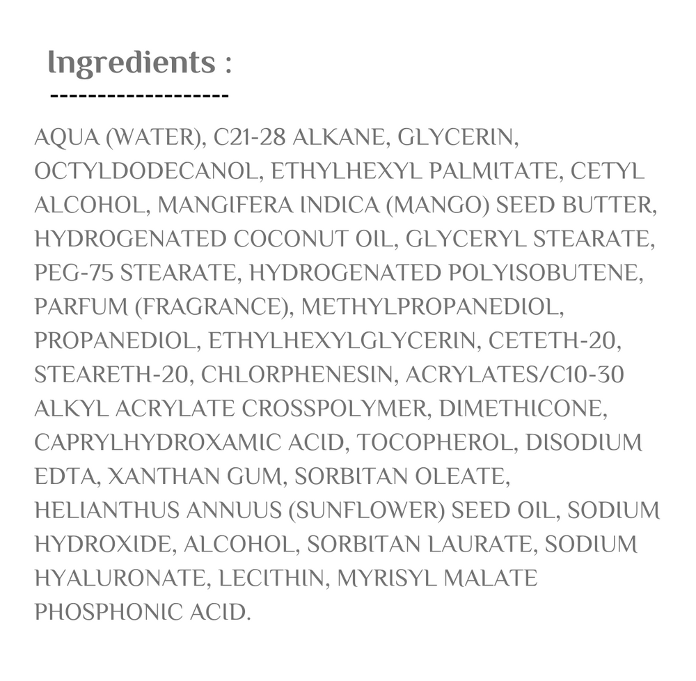 يرطب البشرة بعمق موفر الراحة الفورية والطويلة الأمد بتركيبته غير الدهنية، المثالي لأنواع البشرة الجافة إلى الجافة جدًا. تحتوي هذه التركيبة على حمض الهيالورونيك، عامل ترطيب قوي يحتفظ بالرطوبة في البشرة. مع الأخذ بعين الاعتبار مكوناته مثل لؤلؤ المياه من الأنهار الجليدية، تنشط البشرة وتستعيد فورًا صفة مضيئة. بالإضافة إلى ذلك، توفر تركيبته الناعمة والمخملية، ورائحته المائية، الانتعاش الفوري والراحة، تارك بشرتك ناعمة ومرنة. أيضًا، هذا الكريم غير ساد للمسام يهدئ البشرة طوال اليوم ويقلل من الشد بنسبة 100%.