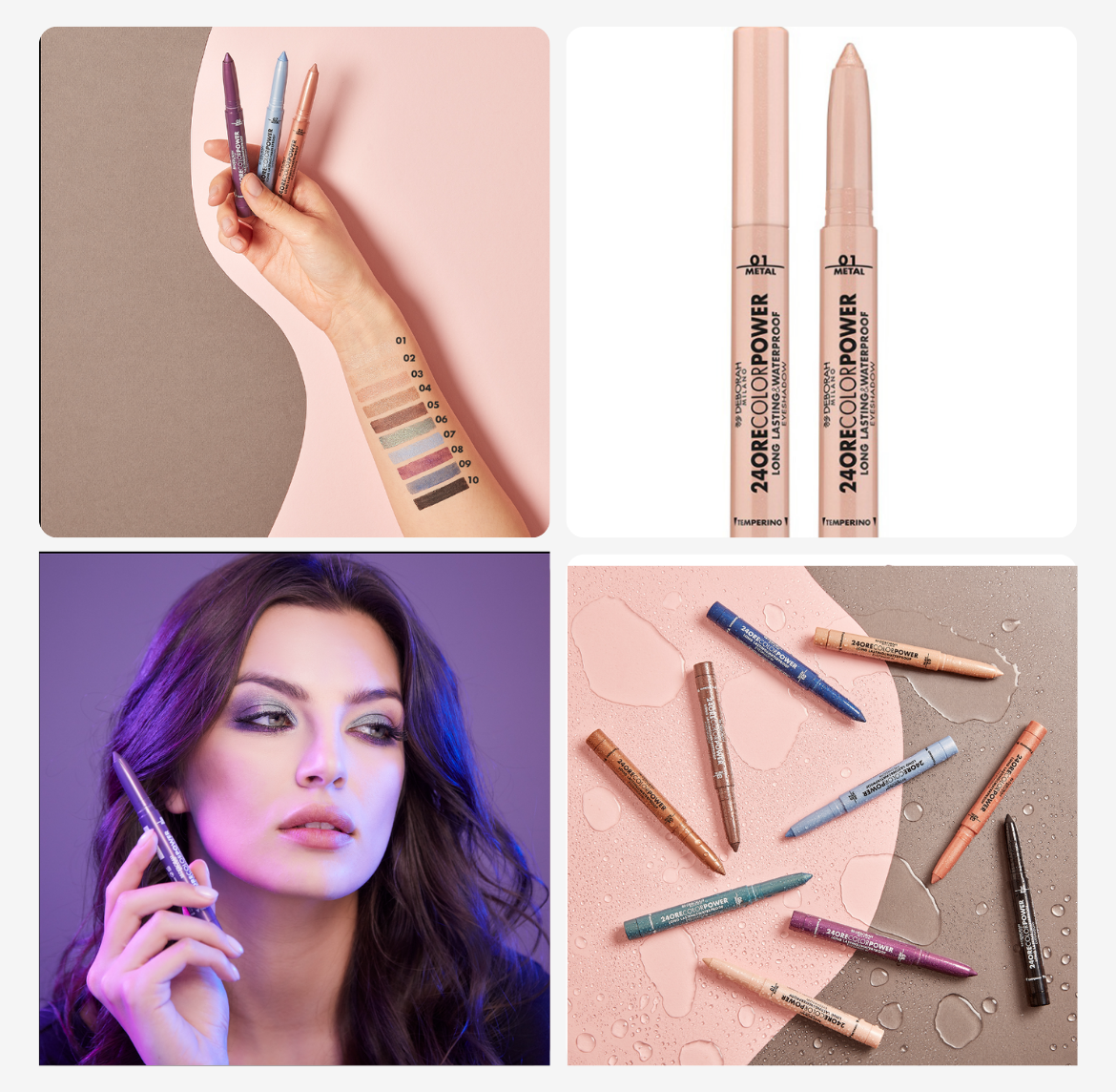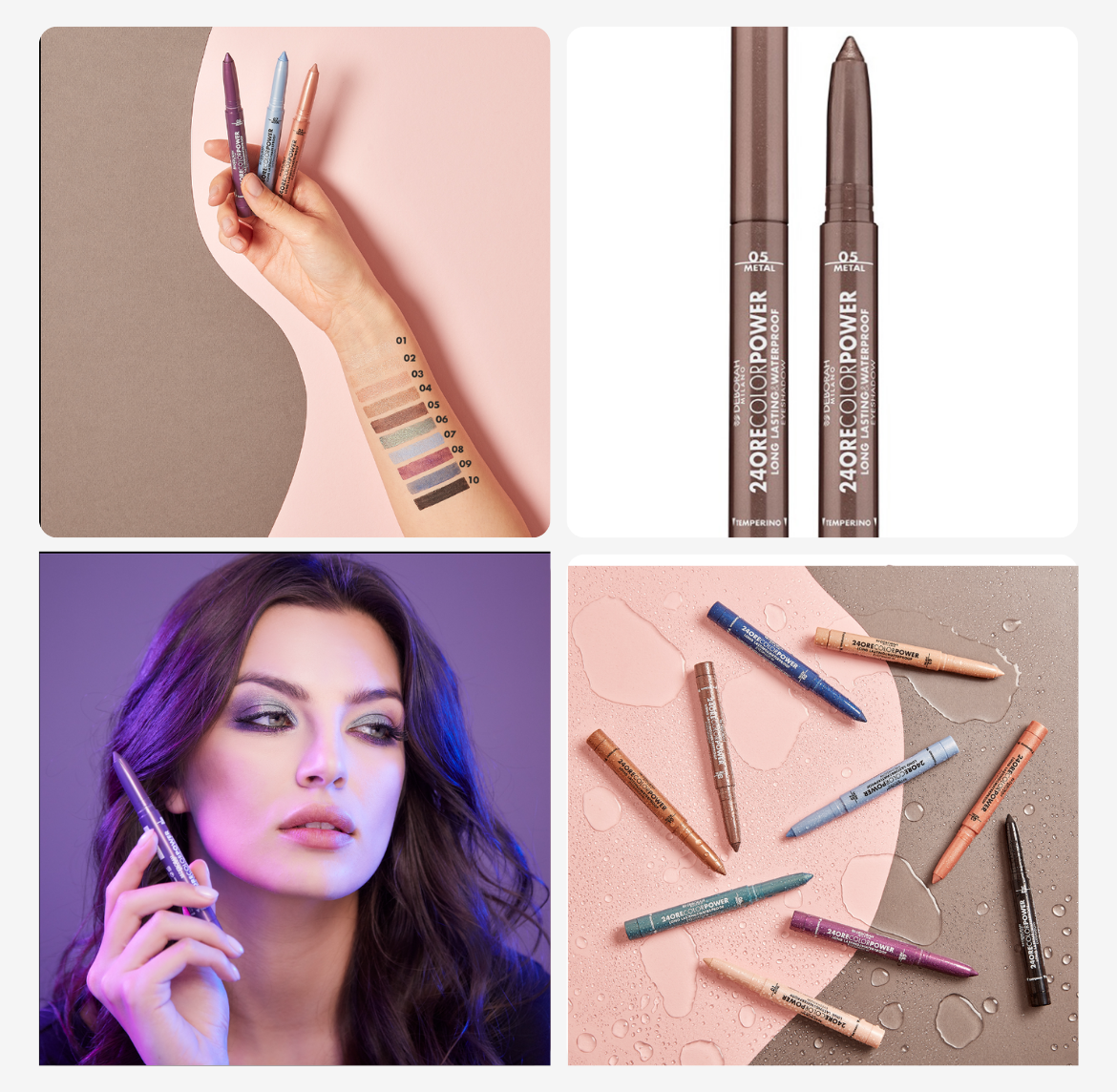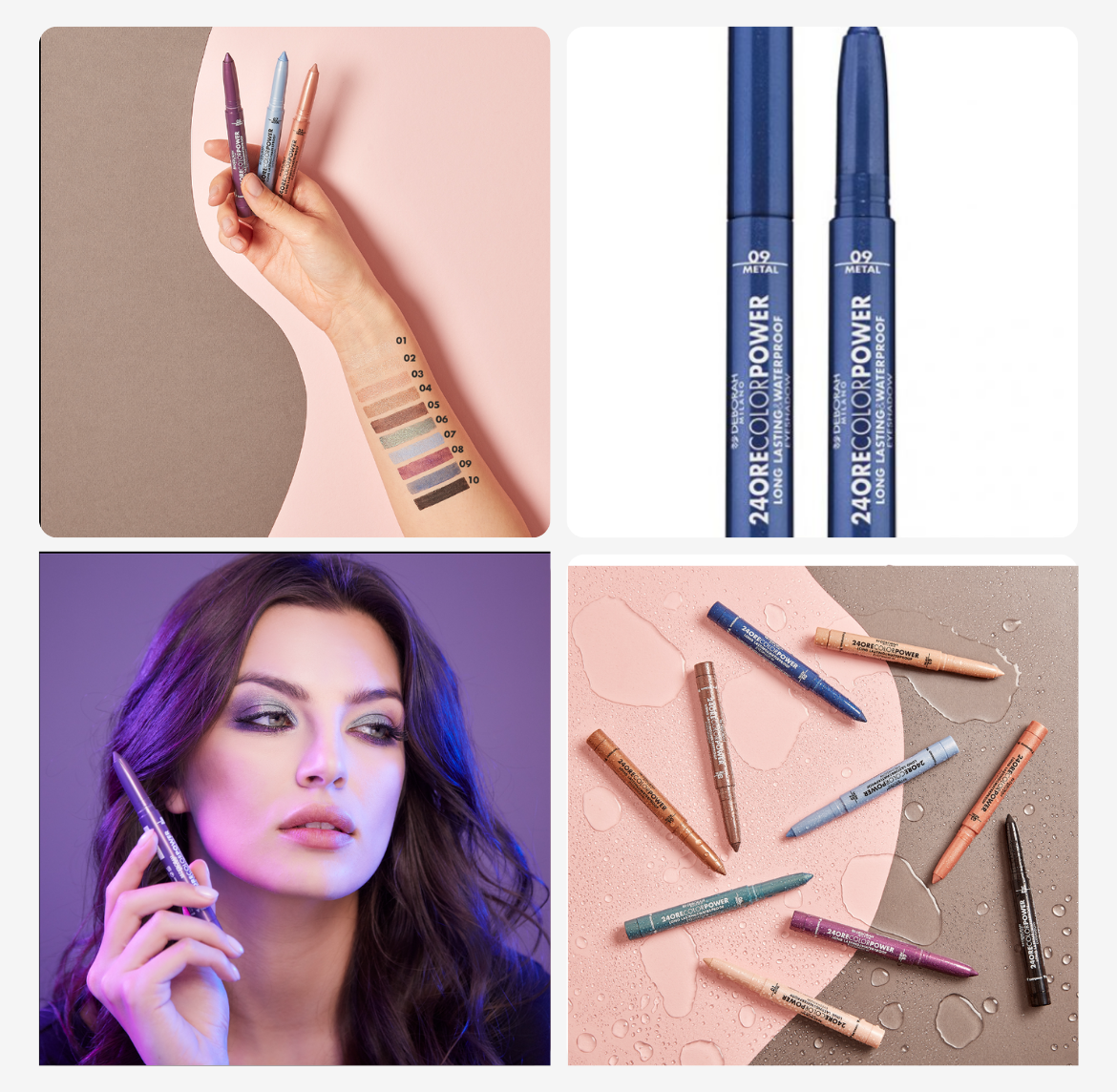 قلم ظل العيون بألوان فاتحة ولامعة. تتميز التركيبة بمقاومتها للماء. ورغم تركيبتها الكريمية، إلا أنها تحتفظ بثباتها. يتيح لك القلم الضخم المتدوّر سهولة الاستخدام.