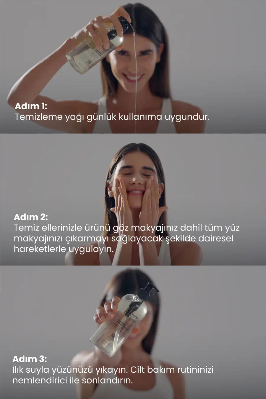 توضع كمية مناسبة من الزيت على البشرة الجافة، وتدلكبلطف بحركات دائرية لإذابة المكياج والأوساخ. يضاف قليلًا من الماء لتتحول التركيبة إلى حليب خفيف، ثم يشطف جيدًا بالماء الفاتر. يمكن متابعته باستخدام غسول رغوي كخطوة ثانية للتنظيف العميق.