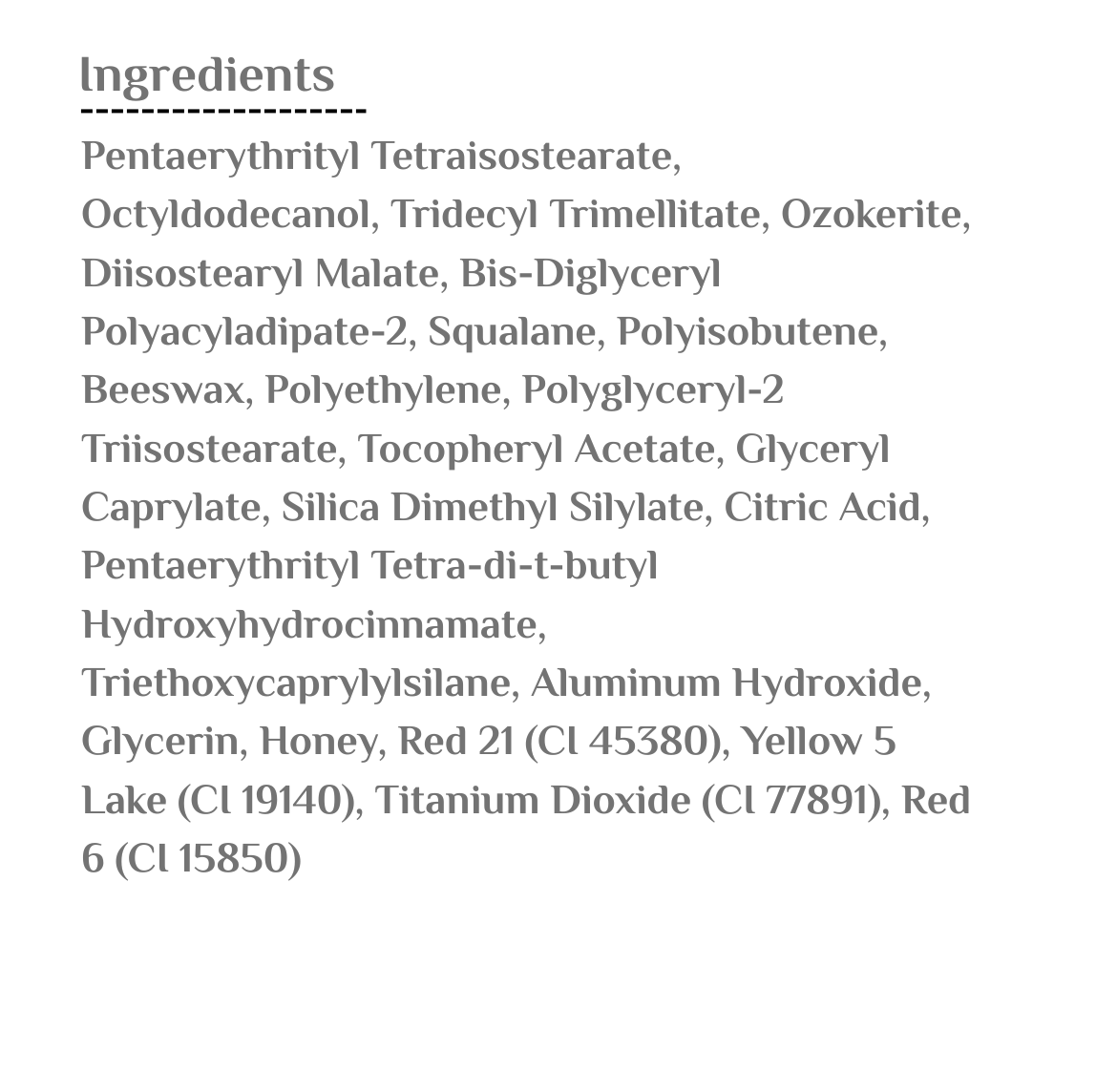 شمع العسل، زبدة الشيا، سكوالين طبيعي، غليسيرين، فيتامين E، عطر العسل، شمع الكارنوبا، ملوّنات آمنة للشفاه.