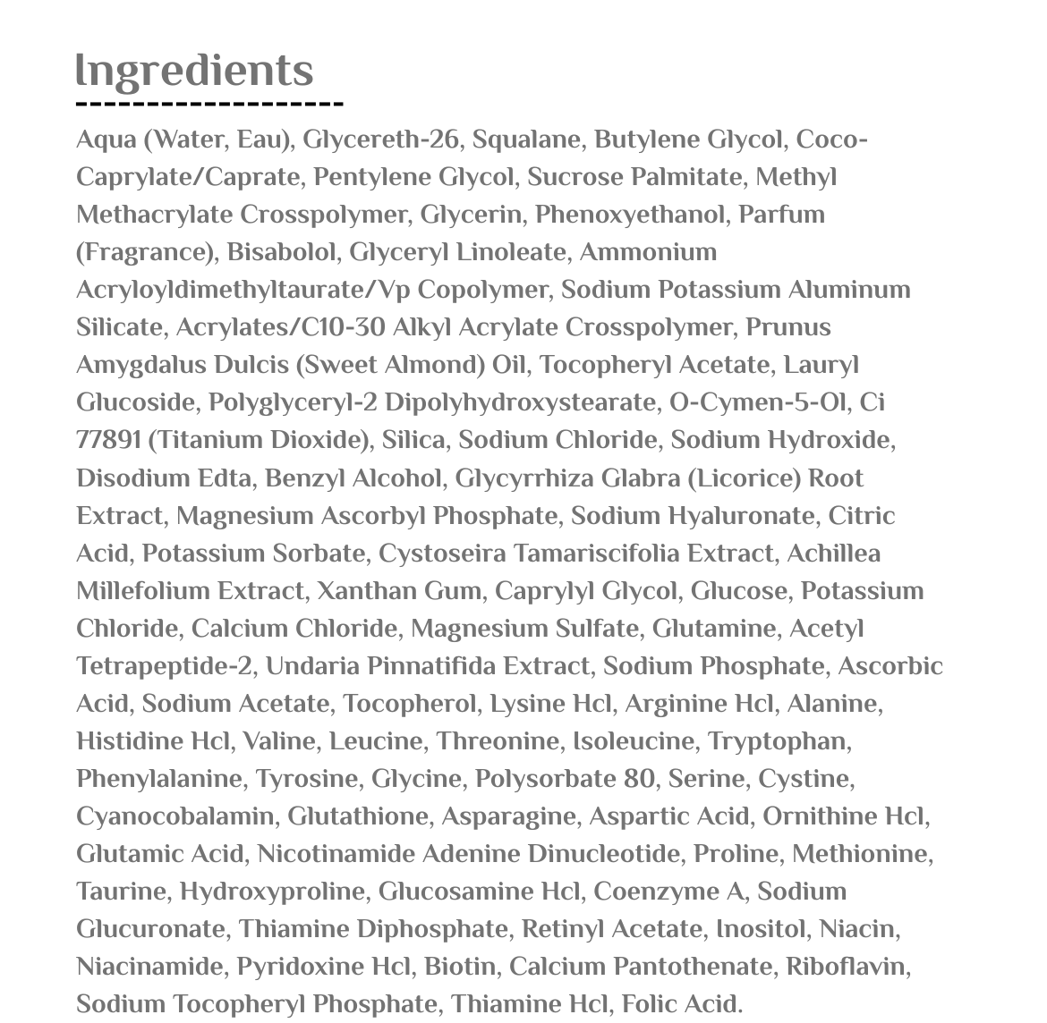 مضادات أكسدة متعددة (فيتامين E، Glutathione، Niacinamide): تحمي البشرة من الضرر البيئي.