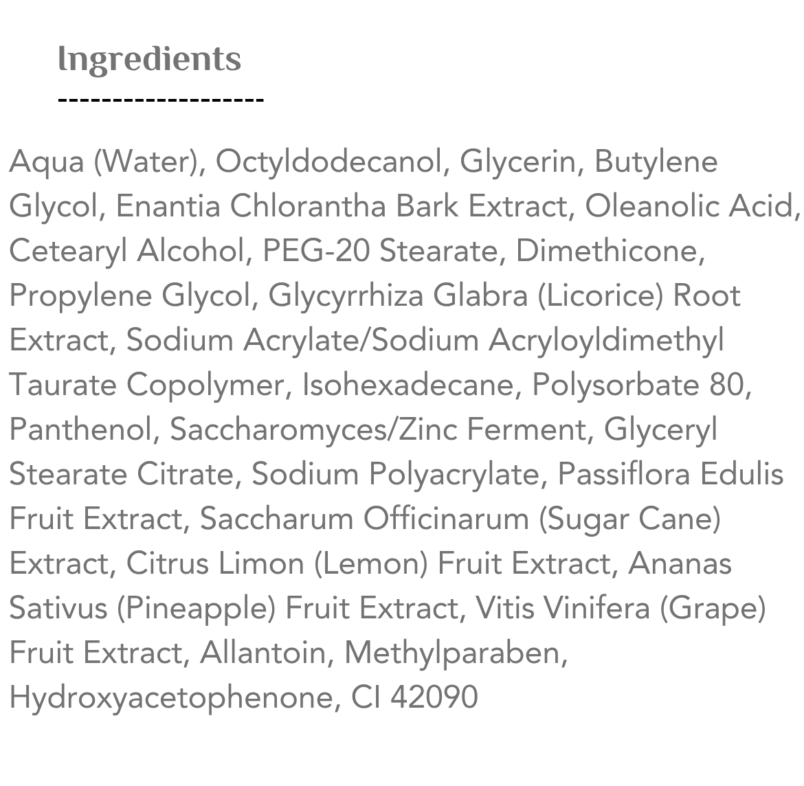 أحماض AHA, مستخلص إنانتيا كلورانثا, مستخلص الكستناء الحصان, مستخلص عرق السوس, حمض أولينوليك, بانتينول, فيتامين A, مركب الزنك-البروتين