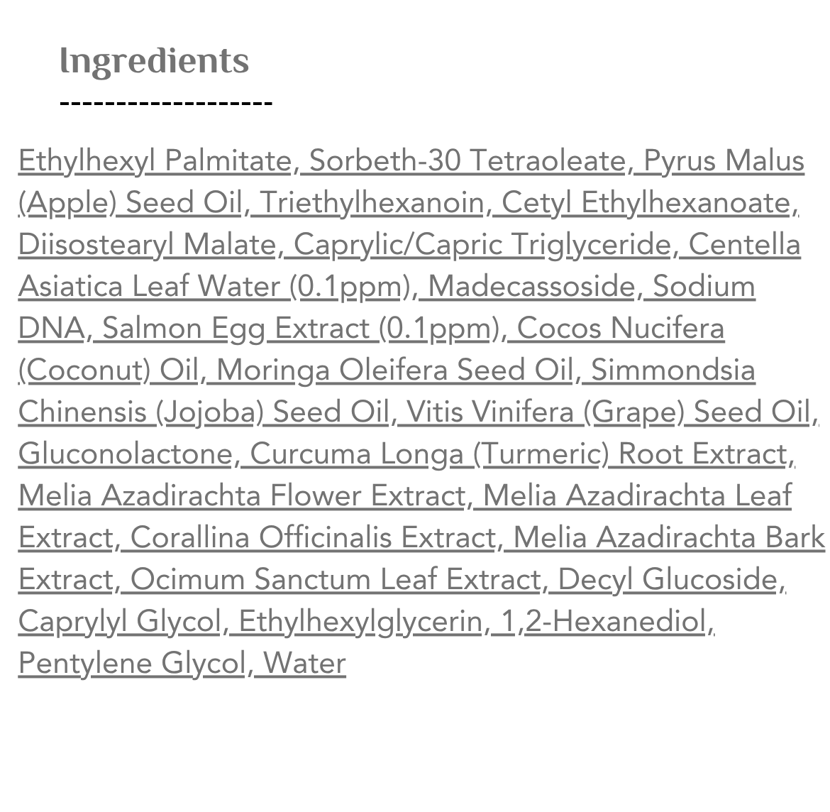 مُغنى بزيت بذور التفاح، ماء أوراق السنتيلا الآسيوية، مستخلص بيض السلمون وPDRN، ليعمل على تهدئة وترطيب البشرة الجافة.