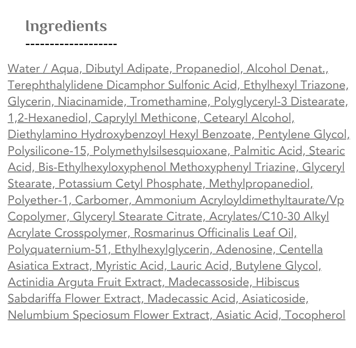 تتضمن تركيبته مكونات فعالة مثل نبات السنتيلا آسياتيكا المهدئ والمقوي، مادة الماديكاسوسيد المرطبة، ومستخلصات زهرية غنية بمضادات الأكسدة وخصائص علاجية تعزز صحة بشرتك وتمنحها مظهراً صحياً ونضراً.
