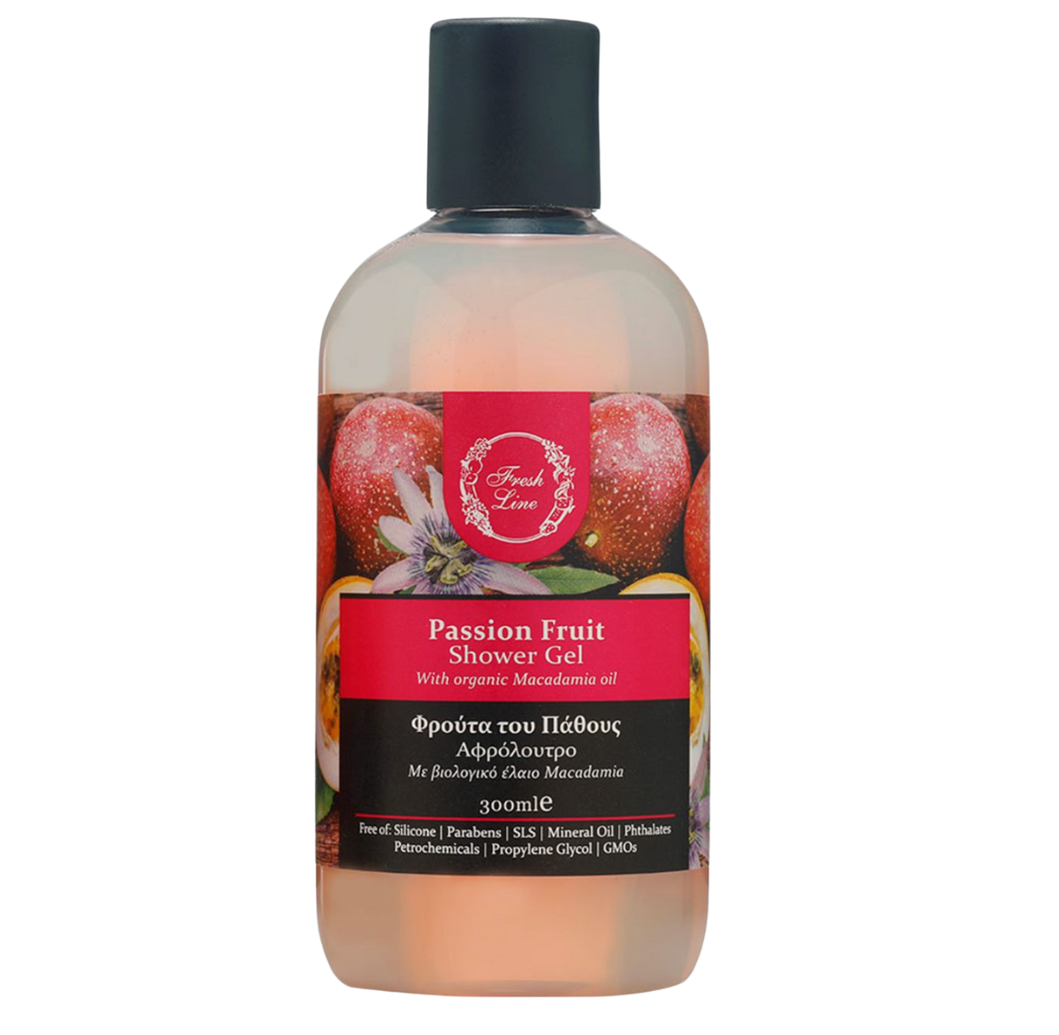 مستخلص فاكهة الباشن فروت – زيت الماكاديميا – بانثينول – جلسرين – مكونات طبيعية لطيفة تنظف وترطب البشرة.