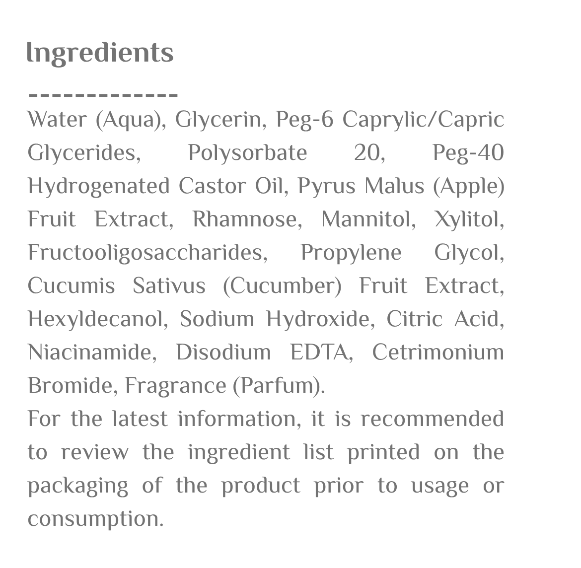 ماء (Aqua)، جلسرين، PEG-6 كابريليك/كابريك جلسريد، بوليسوربات 20، PEG-40 زيت الخروع المهدرج، مستخلص تفاح، رامنوز، مانيتول، زيلتول، فركتوليجوساكارايد، بروبيلين جليكول، مستخلص خيار، هيكسيلديكانول، هيدروكسيد الصوديوم، حمض الستريك، نياسيناميد، ثنائي صوديوم EDTA، سيتريوم بروميد، عطر (Parfum).