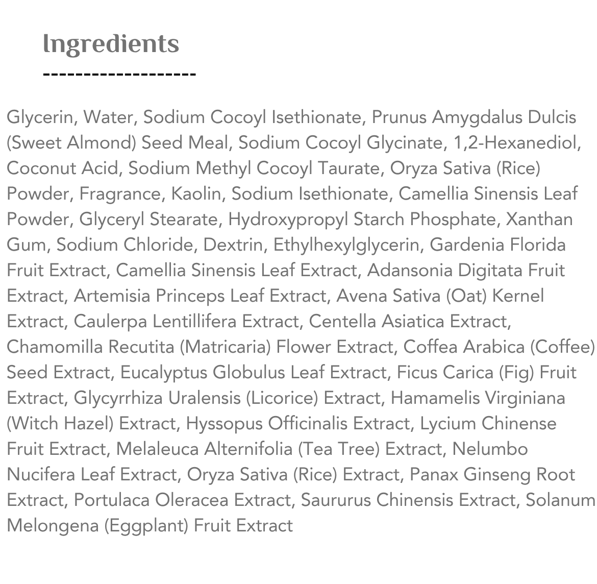 غسول الوجه الغني بماء وأرز البودرة ينظّف البشرة بفعالية من الأوساخ والشوائب دون أن يجرّدها من رطوبتها الطبيعية. يحتوي على مستخلص بندق الساحرة ونبتة الزوفا لتفتيح البشرة وتهدئتها بلطف. يتميز الغسول بتركيبة مطاطية شبيهة بالموتشي، تم تحضيرها عبر عملية عجن تقليدية، مما يساعد على تنظيف المسام بعمق وتنقية البشرة ليمنحها مظهرًا نقيًا ومشرقًا.