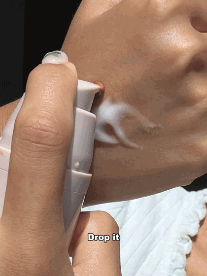 المزج: استخدمي أصابعك أو فرشاة لتوزيع القطرات بشكل متساوٍ على البشرة.