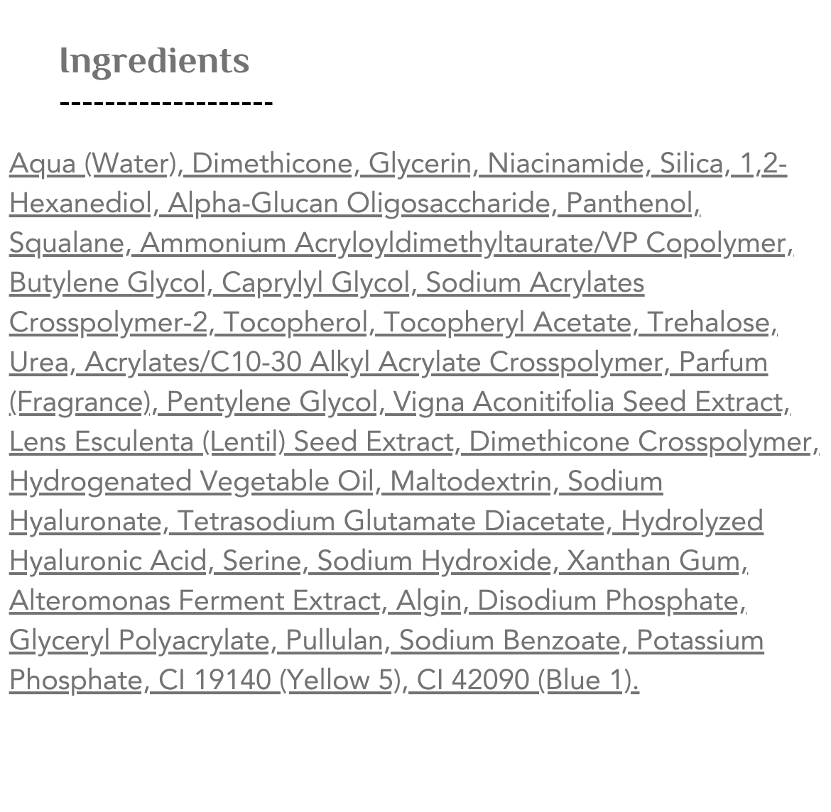 حمض الهيالورونيك (وزن جزيئي منخفض ومتوسط). برو-فيتامين ب5, مجمع الترطيب ثلاثي الأبعاد, فيتامين اي, فيتامين أ