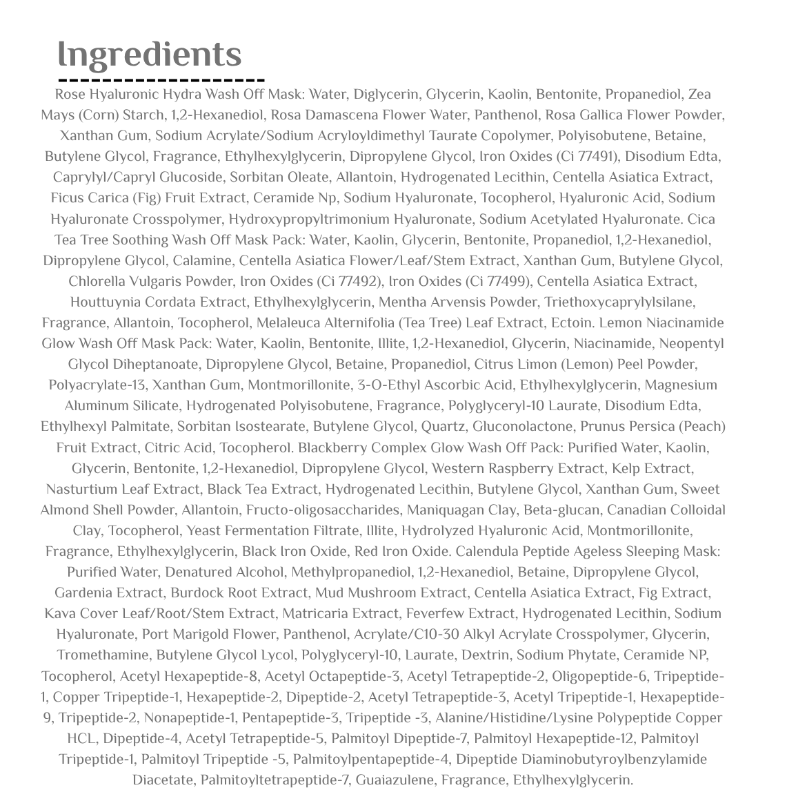 • ماسك روز هايلورونيك هيدرا: ماء، جلسرين، كاولين، بنتونايت، ماء ورد دمشق، خلاصة التين، بانثينول، سيراميد NP، حمض الهيالورونيك، نياكيناميد، مستخلص سنتيلا أسياتيكا.