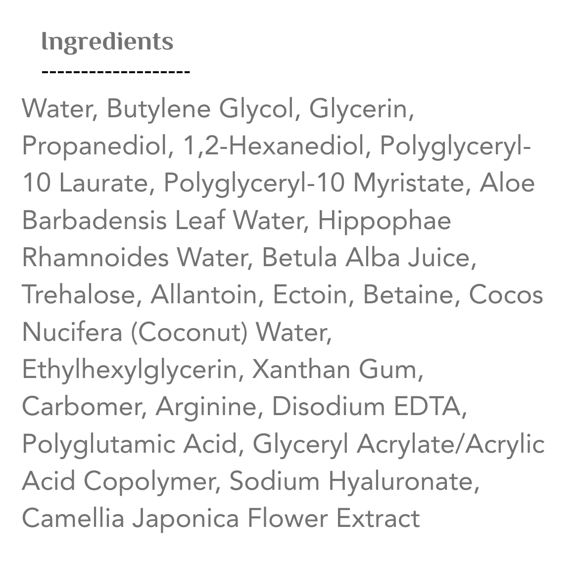 تونر مرطب غني بمستخلص عصارة شجرة البتولا، حمض الهيالورونيك، وماء جوز الهند لتغذية البشرة وترطيبها بعمق. يحتوي أيضاً على عصارة الألوفيرا، الإكتوين، والألانتوين لتوفير عناية مهدئة وترطيب إضافي، مما يمنح البشرة ملمساً ناعماً ومظهراً صحياً ومشرقاً. يتميز بتركيبة هيبوالرجينيك معتمدة من EWG، ما يجعله آمناً ولطيفاً حتى على البشرة الحساسة.