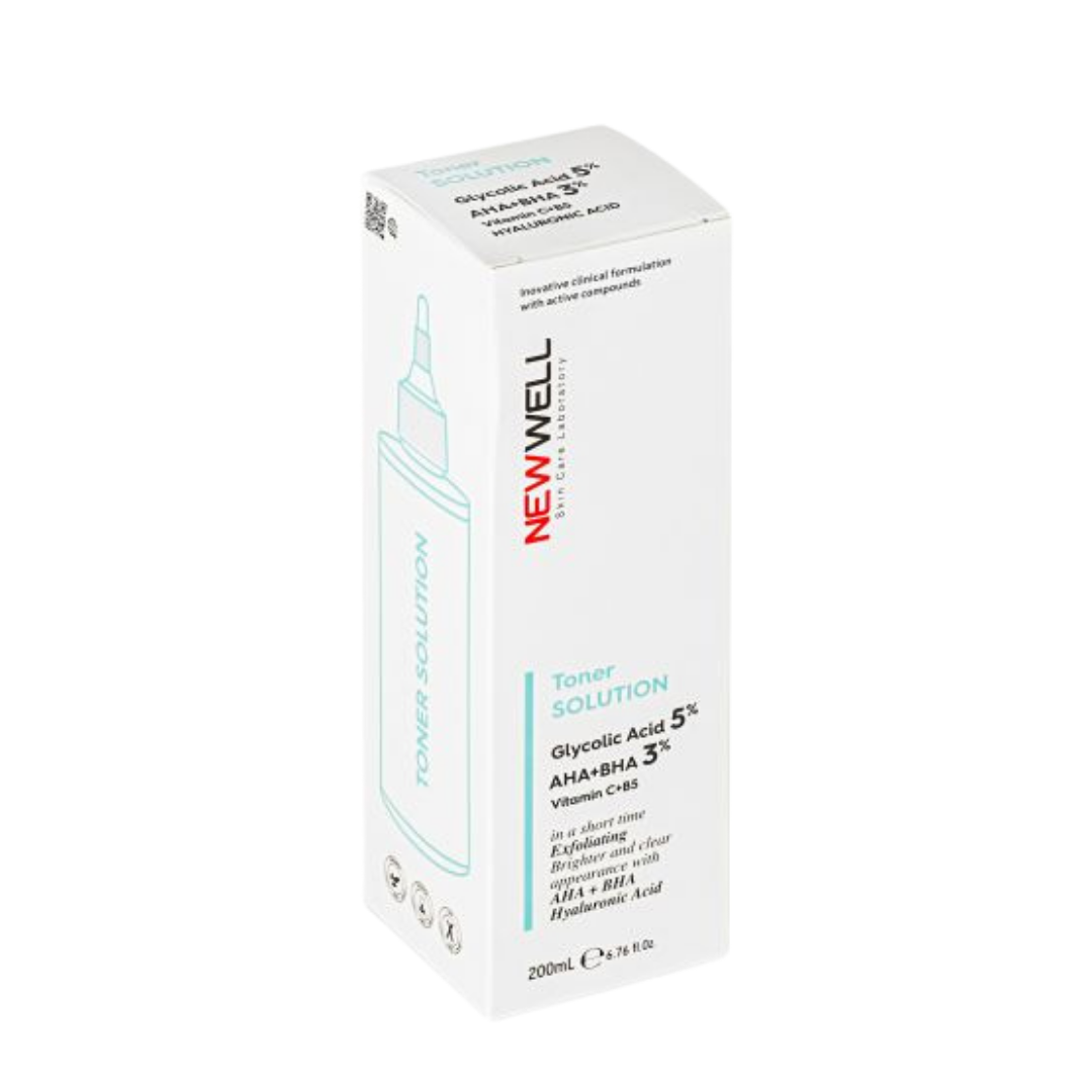 NEW WELL Toner Solution Glycolic Acid 5% AHA+Bha3% - 200ml | نيو ويل تونرالمقشر بحمض الجليكوليك AHA 5% وBHA 3% لتجديد البشرة وتنقية المسام - 200 مل