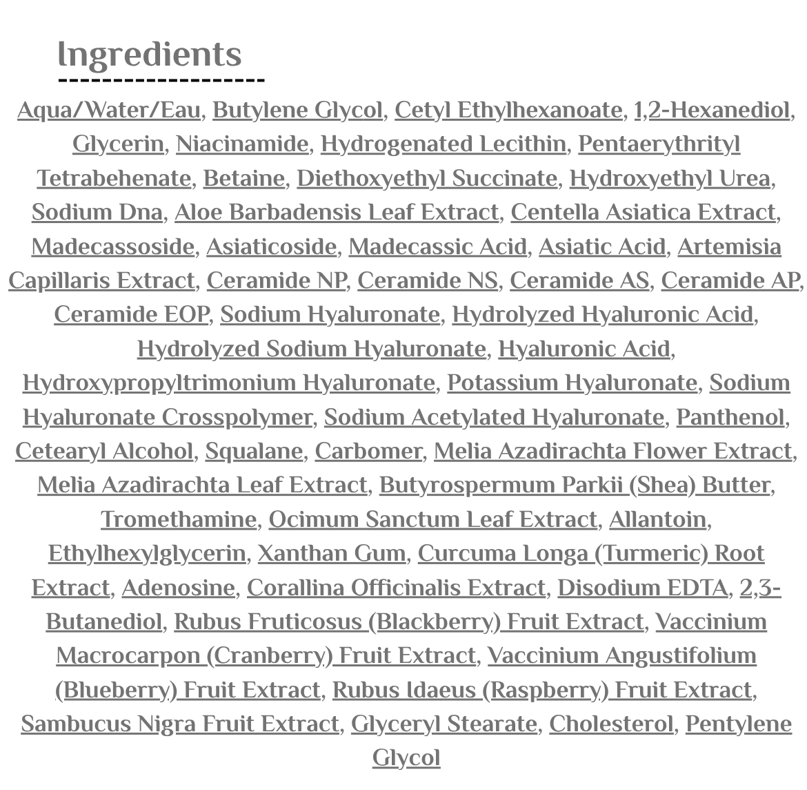 خلاصة الألوفيرا، PDRN (Polynucleotide)، مكونات مرطبة ومهدئة.
