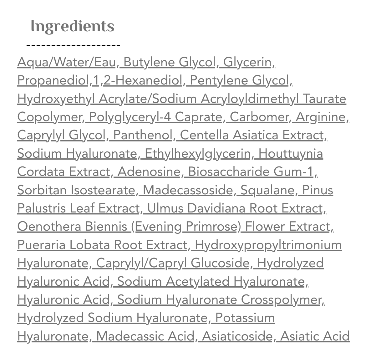 • مركبات Cica: (إبيميديوم، ماديكاسوسايد، حمض الماديكاسيك، أسياتيكاوسايد، حمض الأسياتيكا) لتجديد البشرة وتحفيز الكولاجين وتهدئة التهيج.