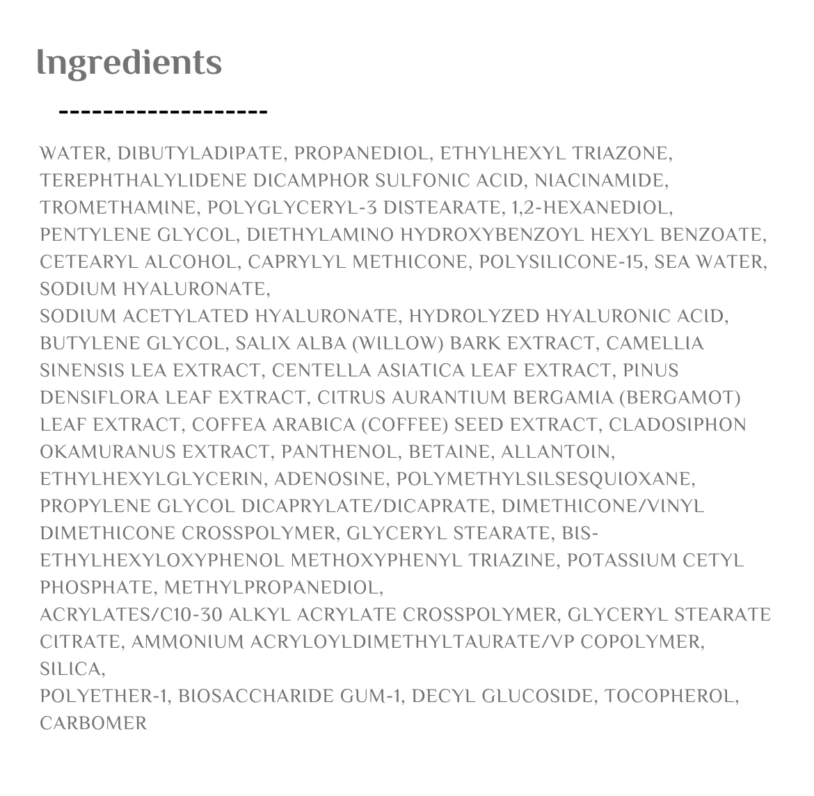نياسيناميد, هيالورونيك اسيد, فلاتر كيميائية, مياه البحر العميق, مستخلص لحاء الصفصاف, سينتيلا, بانتينول, بيتائين, الانتوئين