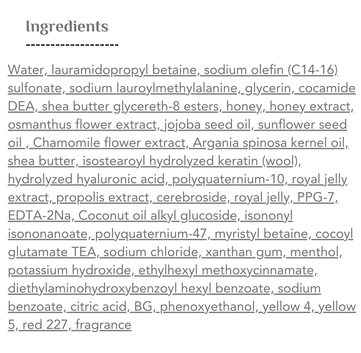 شامبو فاخر يحتوي على مكونات مغذية مثل مستخلص العسل، زيت بذور الجوجوبا، والهيالورونيك اسيد، ليمنح شعركِ تنظيفًا لطيفًا مع ترطيب عميق.