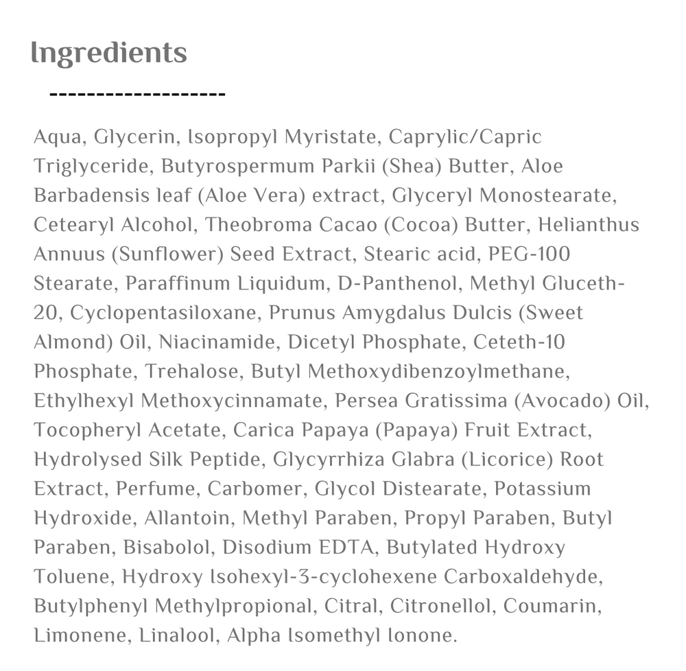 - تركيبة فاخرة غنية بحمض الهيالورونيك وزبدة الشيا وخلاصة النباتات الطبيعية.