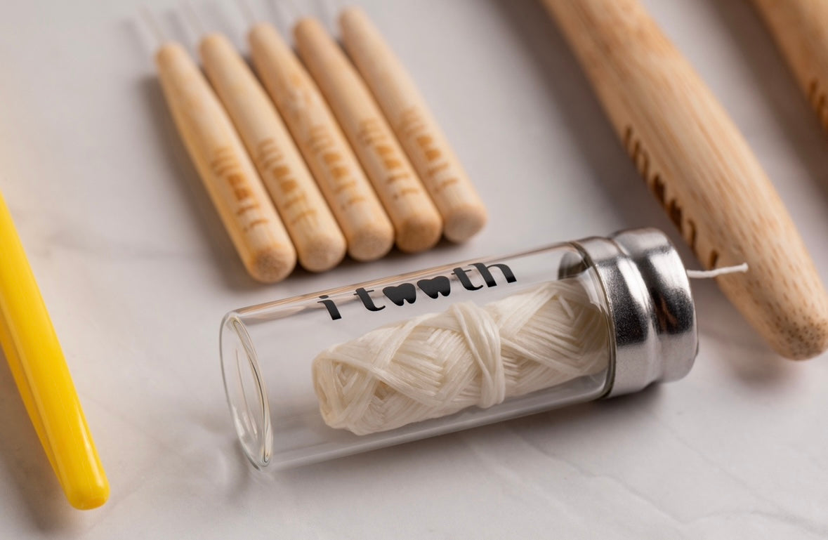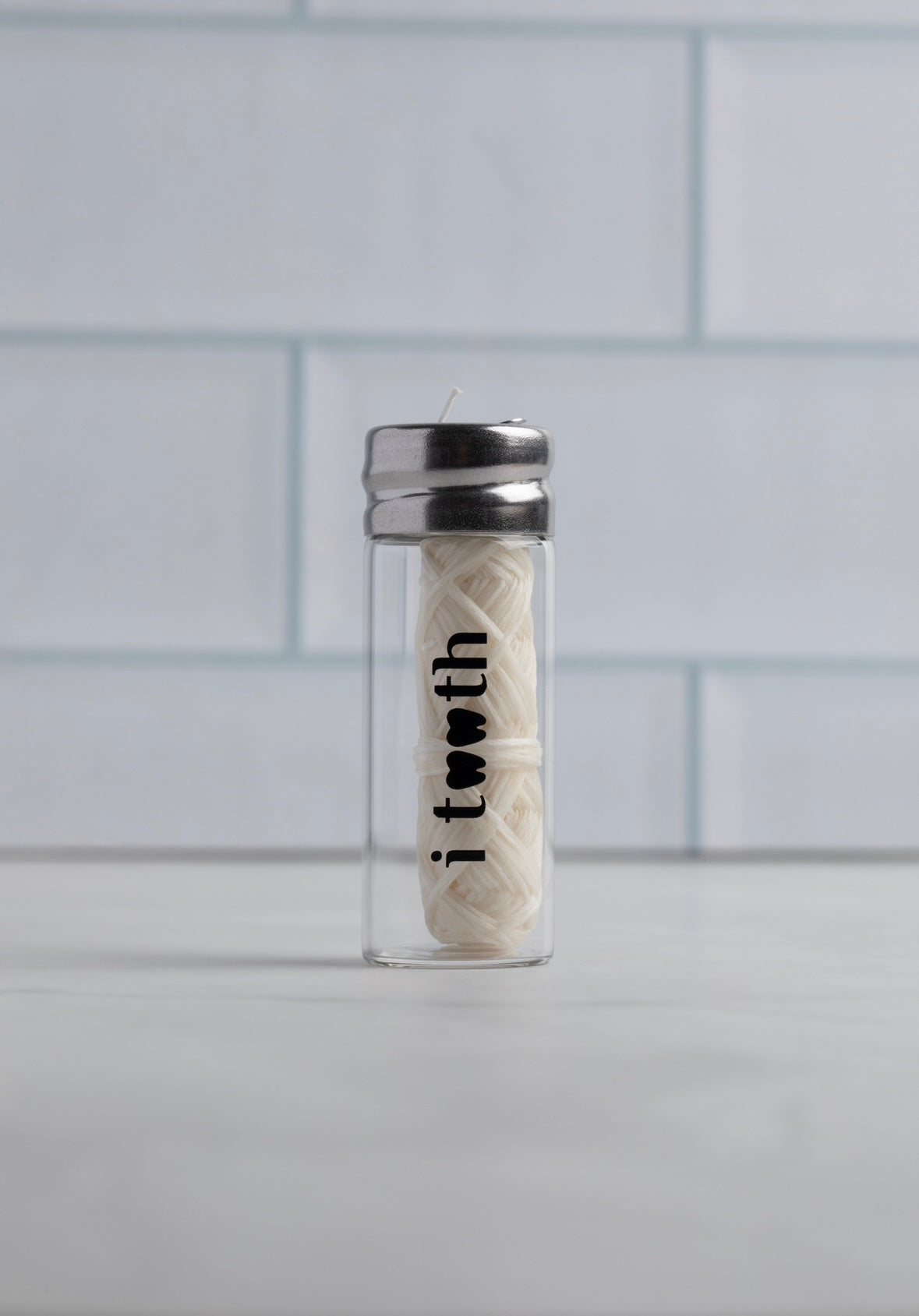 نظف أسنانك بفعالية مع خيط الأسنان الطبيعي المعبأ في عبوة زجاجية أنيقة قابلة لإعادة الاستخدام.