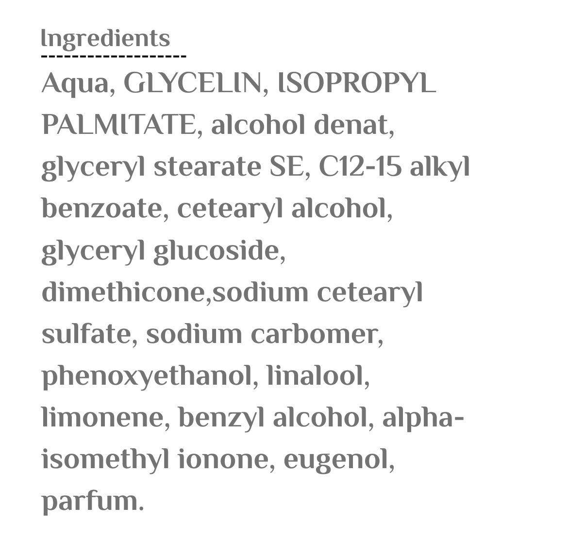 ماء (Aqua)، جلسرين، إيزوبروبيل بالميتات، كحول دنات، غليسيريل ستيرات، ثنائي الميثيكون، كاربومير الصوديوم، فينوكسي إيثانول، لينالول، ليمونين، بنزيل كحول، ألفا أيزو ميثيل أيونون، يوجينول، عطر (Parfum).