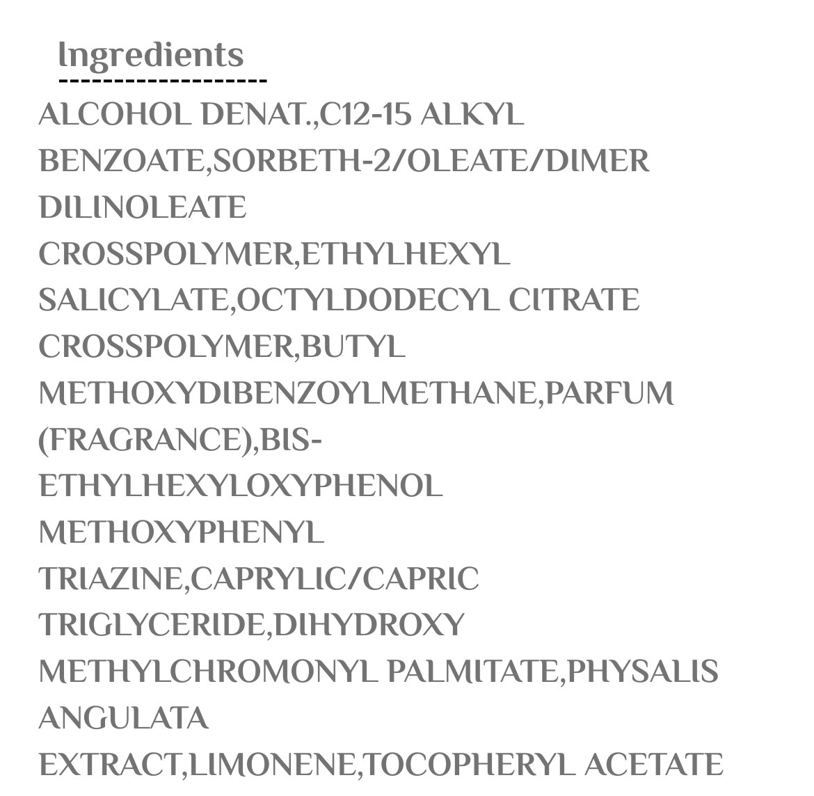 يحتوي على فلاتر كيميائية لحماية فعّالة من الأشعة ، مع فيتامين E لترطيب وحماية البشرة من الأكسدة، ومكونات مرطبة ومغذية مثل مستخلص Physalis Angulata.