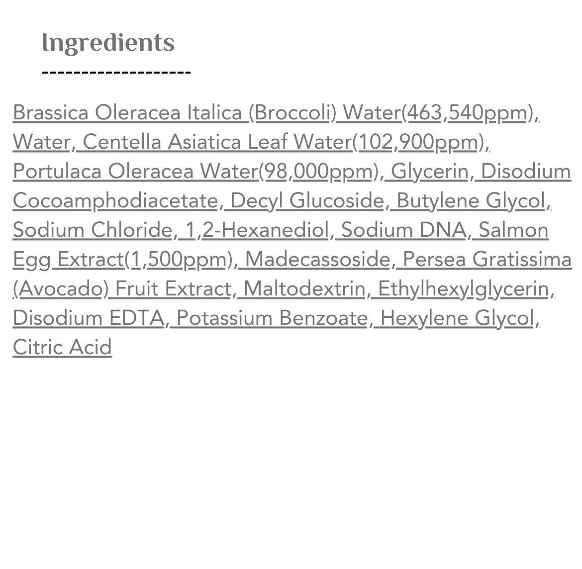 يحتوي أيضًا على خلاصة البورسلان، ماء البروكلي، وببتيدات مستخلصة من الأفوكادو لترطيب البشرة وحماية حاجزها الطبيعي.