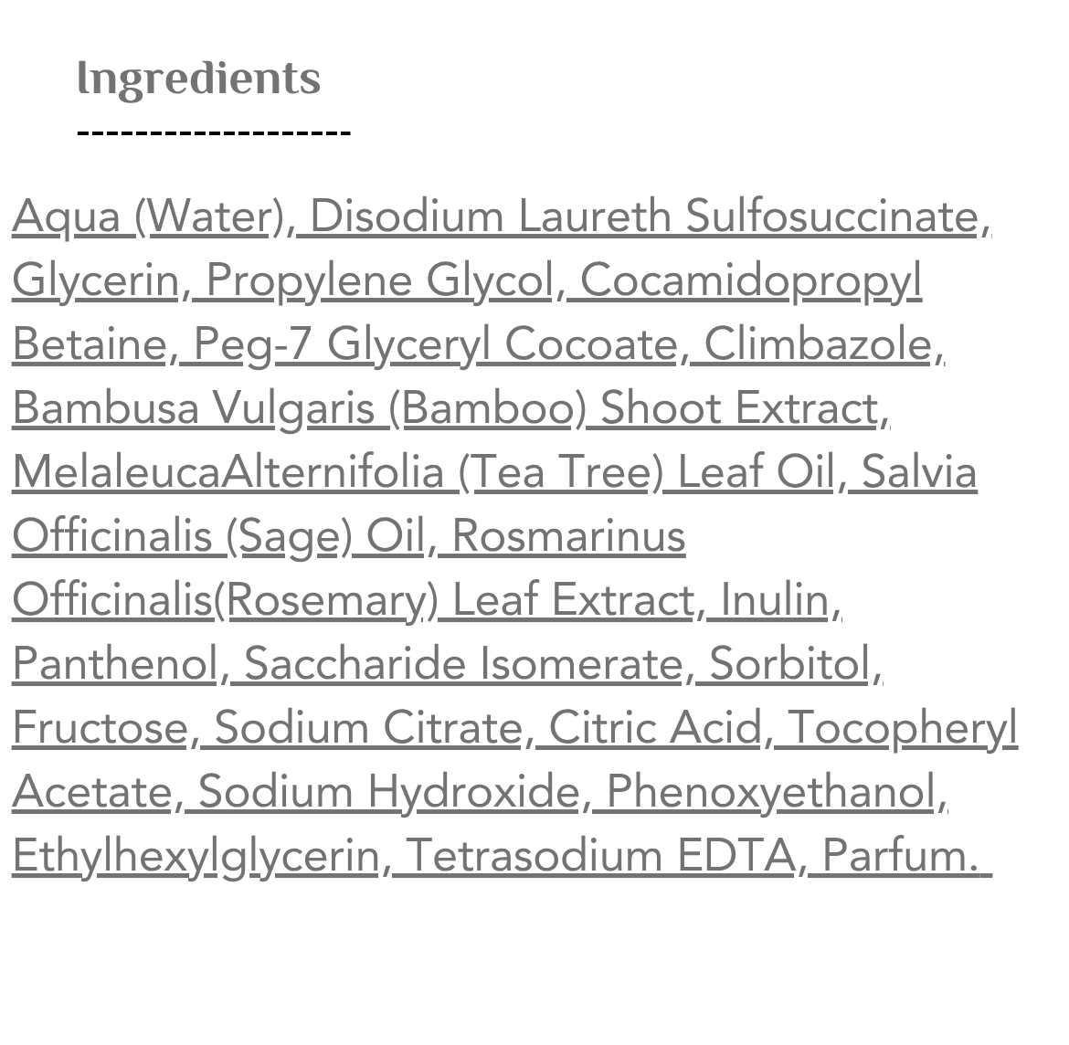 يحتوي على مكونات فعالة مثل البريبايوتيك، مستخلص الخيزران، السكاريد الأيزوميرات، زيت شجرة الشاي، وزيت الميرمية، التي تعمل معًا على تنظيف فروة الرأس بلطف، التخلص من القشرة، ومنع عودتها، مع الحفاظ على توازن الفروة ونعومة الشعر.
