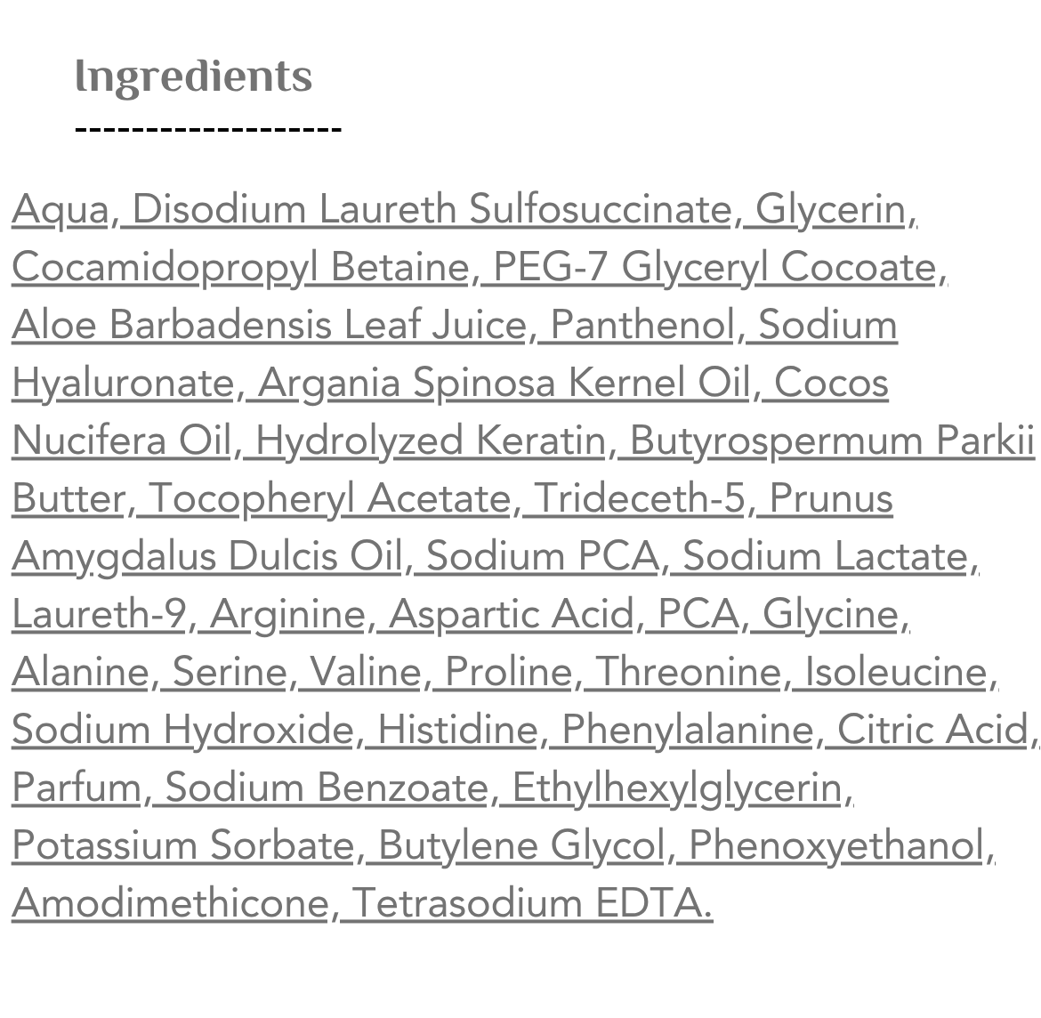 هيالورونيك اسيد, بانتينول, كيراتين, زيت الأرجان, زيت جوز الهند