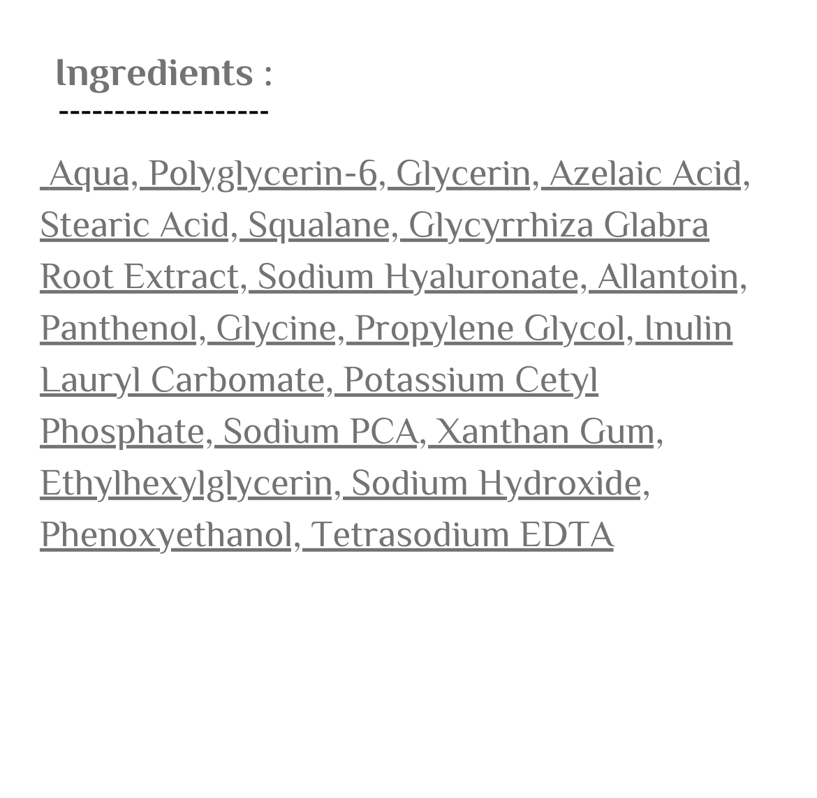المكونات الاساسية:أزليك اسيد 5%, الانتوئين, هيالوروينك اسيد, بانتينول