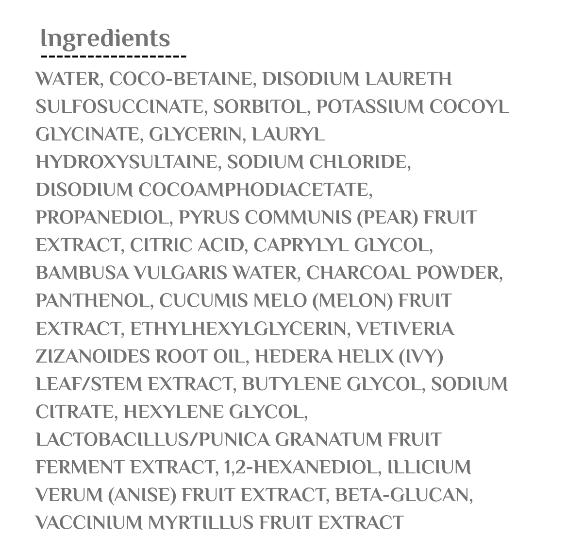 فحم نشط كوري، ماء البامبو، جلسيرين، مستخلص الإجاص، البطيخ، اللبلاب، زيت الفيتيفر، بروبيوتيك الرمان، بيتا جلوكان، بانثينول.