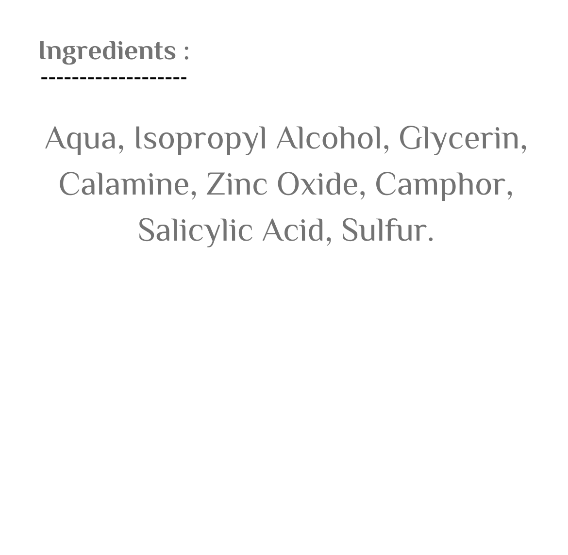 المكونات الاساسية:كحول الأيزوبروبيل، الجلسرين، كالامين، أكسيد الزنك، الكافور، حمض الساليسيليك . لا يحتوي على عطور .