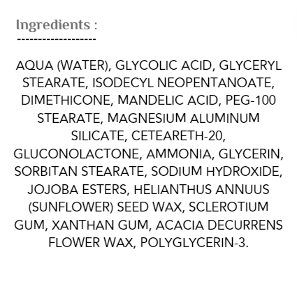 الوصف: يوفر كريم التقشير الليلي المكثف من GLYCO-A® للجميع فوائد التقشير السطحي في المنزل ، مع تركيز حمض الجليكوليك المثالي بنسبة 25٪ للحصول على بشرة أكثر نعومة وثباتا وبشرة أكثر إشراقا. يحتوي Glyco-A Intense Peeling على تركيبة فريدة تحتوي على حمض الجليكوليك الفعال والمكونات المغذية للبشرة. هذا المزيج المتقدم يعمل على إزالة الخلايا الميتة وتحفيز تجديد الخلايا للحصول على بشرة أكثر نعومة وإشراقًا. مناسب لجميع أنواع البشرة، يمكنك الاعتماد على Glyco-A Intense Peeling للحصول على نتائج رائعة. اجعليه جزءًا من روتين العناية بالبشرة الخاص بك واستعدي للإشعاع والجمال!