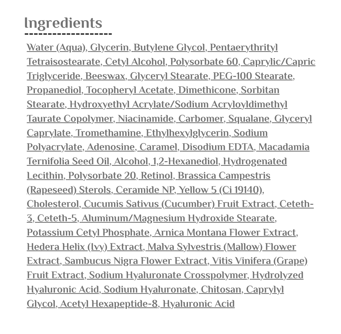 كريم مضاد للشيخوخة بتركيبة متقدمة يجمع بين الريتينول وبيبتيد Btrb (أرجيريلين) لتحسين مظهر التجاعيد وشد البشرة وزيادة مرونتها. يساعد الكريم على تنعيم البشرة، تقليل الخطوط الدقيقة، وتعزيز مرونة الجلد بفضل مزيج من النياسيناميد، السكوالان، السيراميد، وحمض الهيالورونيك. كما يعمل على ترطيب البشرة بعمق وتجديدها لتصبح أكثر نعومة ونضارة.