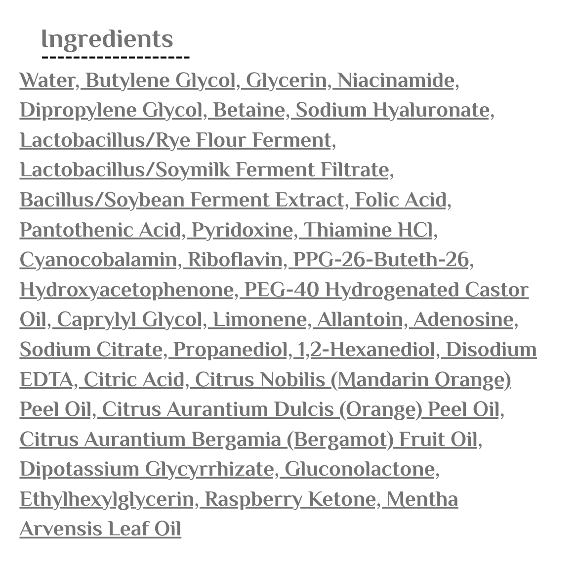 الفيتامينات: مكون من سبع فيتامينات تم الحصول عليها بتقنية التخمير التي تعمل معًا لتحسين إشراقة البشرة وتجديدها.