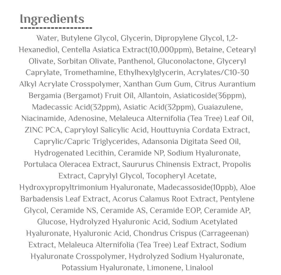 خلاصة عشبة السيكا، أحماض PHA لتقشير لطيف، حمض الهيالورونيك، سيراميد NP، بانثينول، ألانتوين، جلسرين، بيتاين، زيت البرغموت.