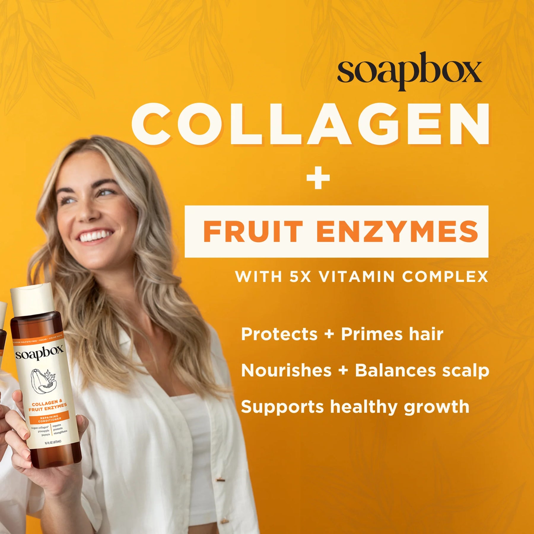 بلسم إصلاح الشعر من Soapbox بتركيبة غنية بالكولاجين والببتيدات وإنزيمات الفواكه (الأناناس والبابايا) ليساعد على تقوية الشعر التالف وحمايته من التكسر، ويعيد له النعومة والمرونة. يحتوي أيضًا على خليط مخصّص لتقوية الروابط داخل الشعرة، بالإضافة إلى مركّب فيتامينات 5X الذي يمنح الشعر مظهرًا صحيًا بسهولة. يناسب جميع أنواع الشعر للنساء والرجال، آمن على الشعر المصبوغ، وخالٍ من السيلكون والبارابين والغلوتين، ونباتي بالكامل.