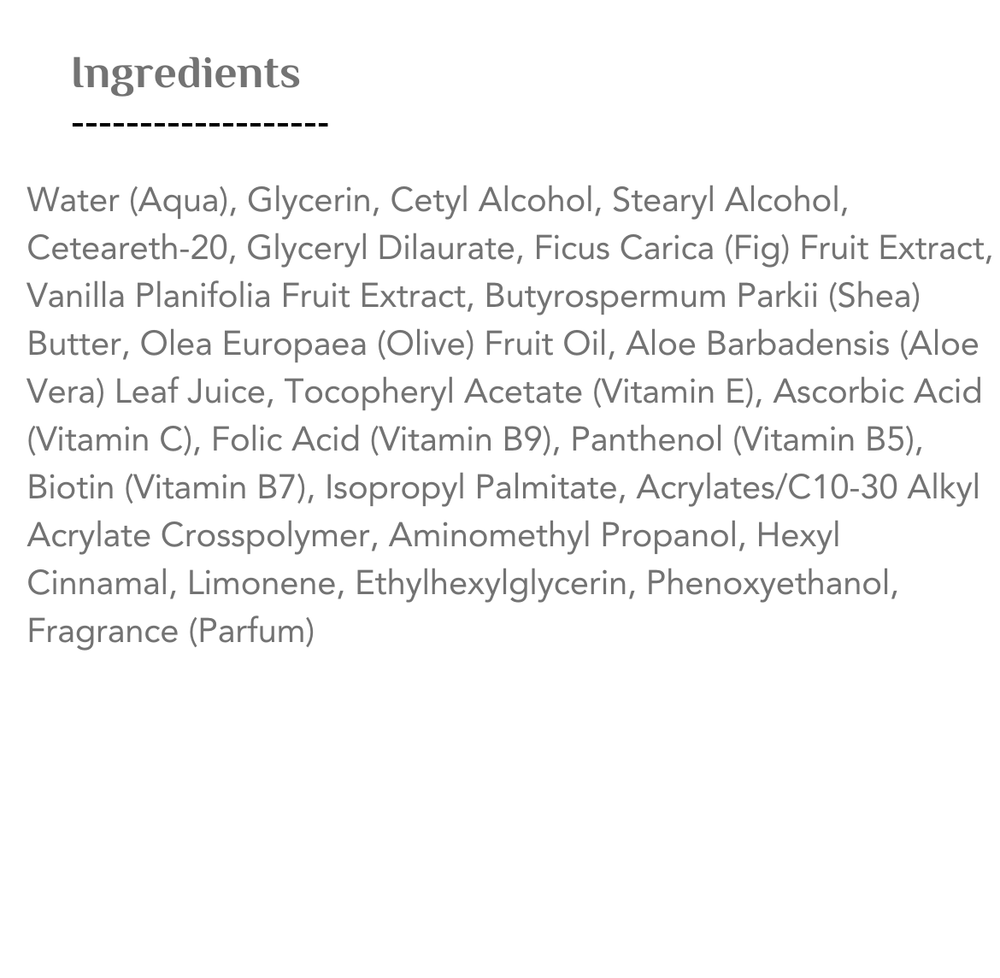 لوشن مرطّب غني يجمع بين رائحة الفانيلا الكريمية وحلاوة التين الناضج المعروفين بخصائصهما المضادة للأكسدة والمهدّئة، ليمنح بشرتك ترطيبًا عميقًا ونعومة فائقة. تمت تقوية التركيبة بمجمّع العناية 5X Skincare Complex الذي يحتوي على زبدة الشيا، الألوفيرا، زيت الزيتون، وفيتاميني اي و سي، لتلبية كل احتياجات بشرتك من التغذية والراحة.